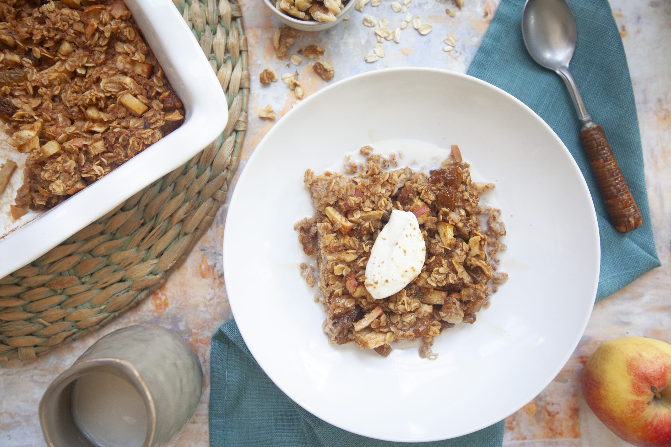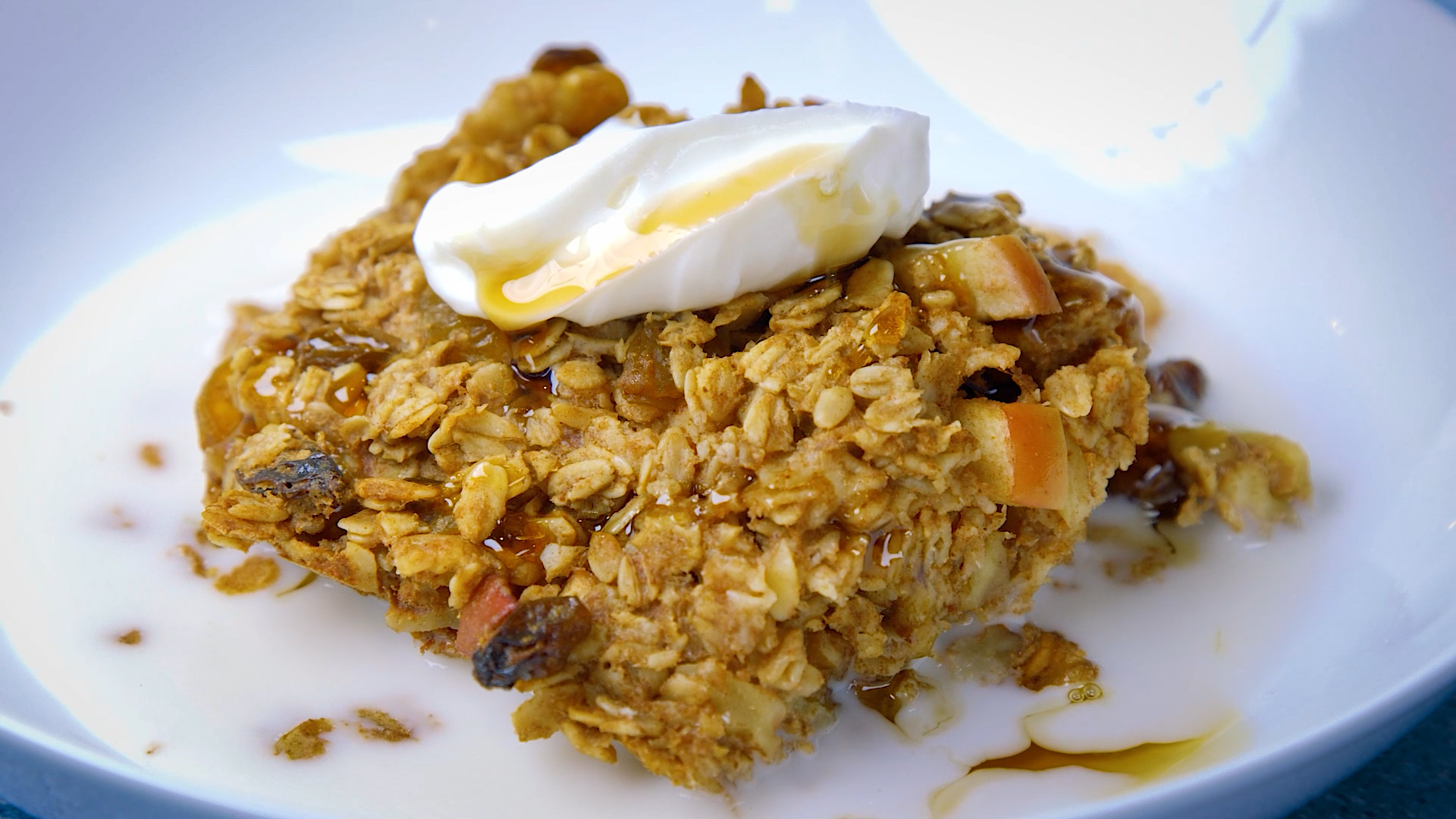 This breakfast recipe may as well be a dessert for how tasty and naturally sweet it is! Baked oatmeal is a warm breakfast casserole whipped up from oats, almond milk, and other ingredients typically found in your kitchen. The texture is similar to bread pudding, combining chewy, soft, and creamy all in one. We suggest adding a bit of your favorite milk, we used almond, then topping with greek yogurt and a drizzle of maple syrup.